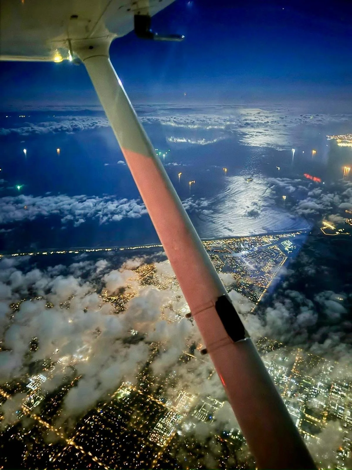 Night flying is a unique experience involving navigating over the darkened countryside and illuminated cities before arriving at your destination. As you line up for the final landing approach, the runway lights guide you safely into landing.